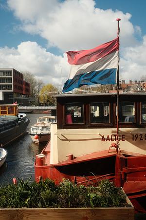A houseboat in Amsterdam with the Dutch flag in front.